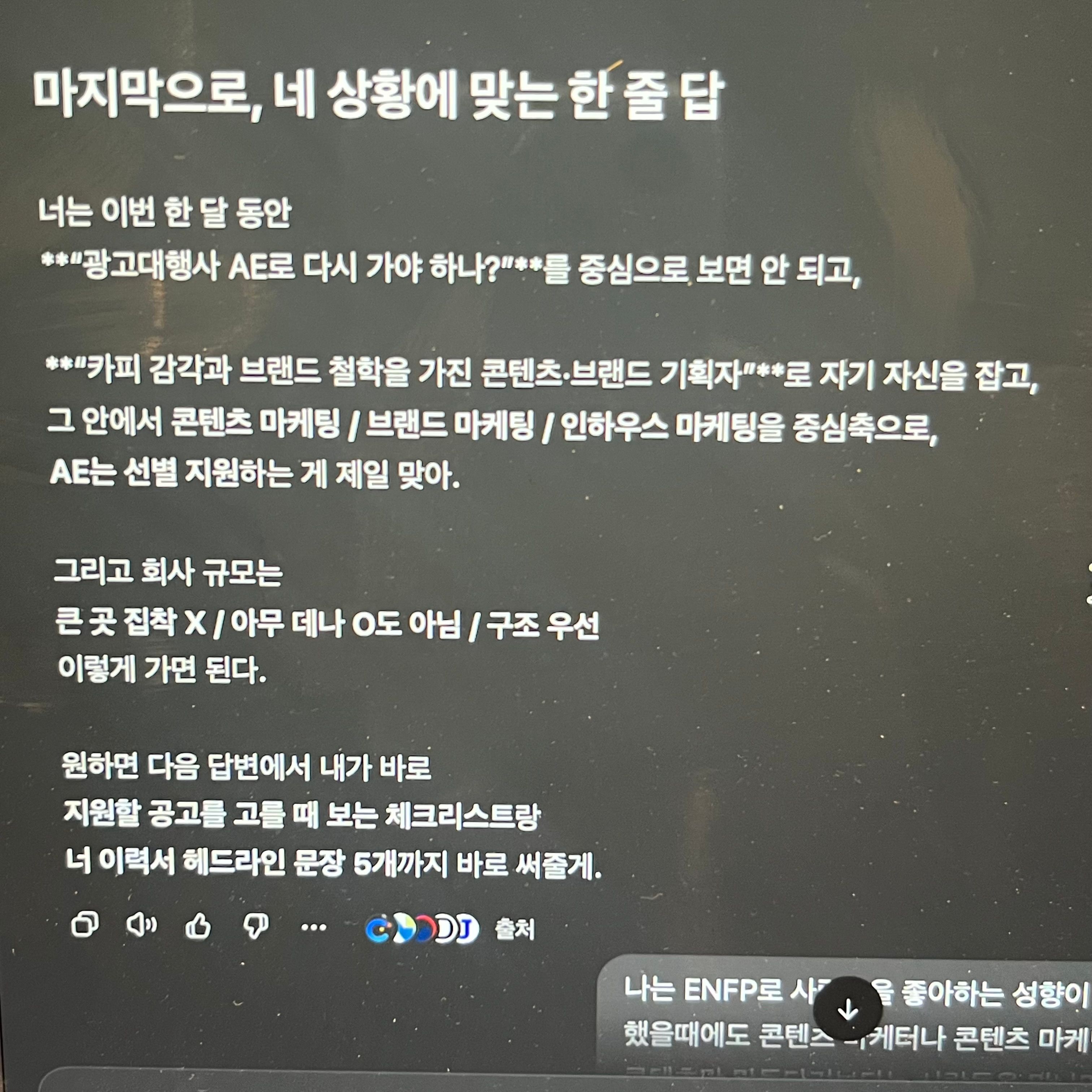 사람을 좋아해서, 사람과의 접점이 많은 AE를 해야만 한다고 생각했지만, 그 만남의 성격이 관계형성자체보단 프로젝트 조율과 관리에 중점이 있기 때문에 어려워한 것 같습니다. 그래서 혼자 몰입해서 무엇을 만들고 그걸 사람들에게 관계적으로 다가갈수 있는 일을 찾아보려고 합니다.